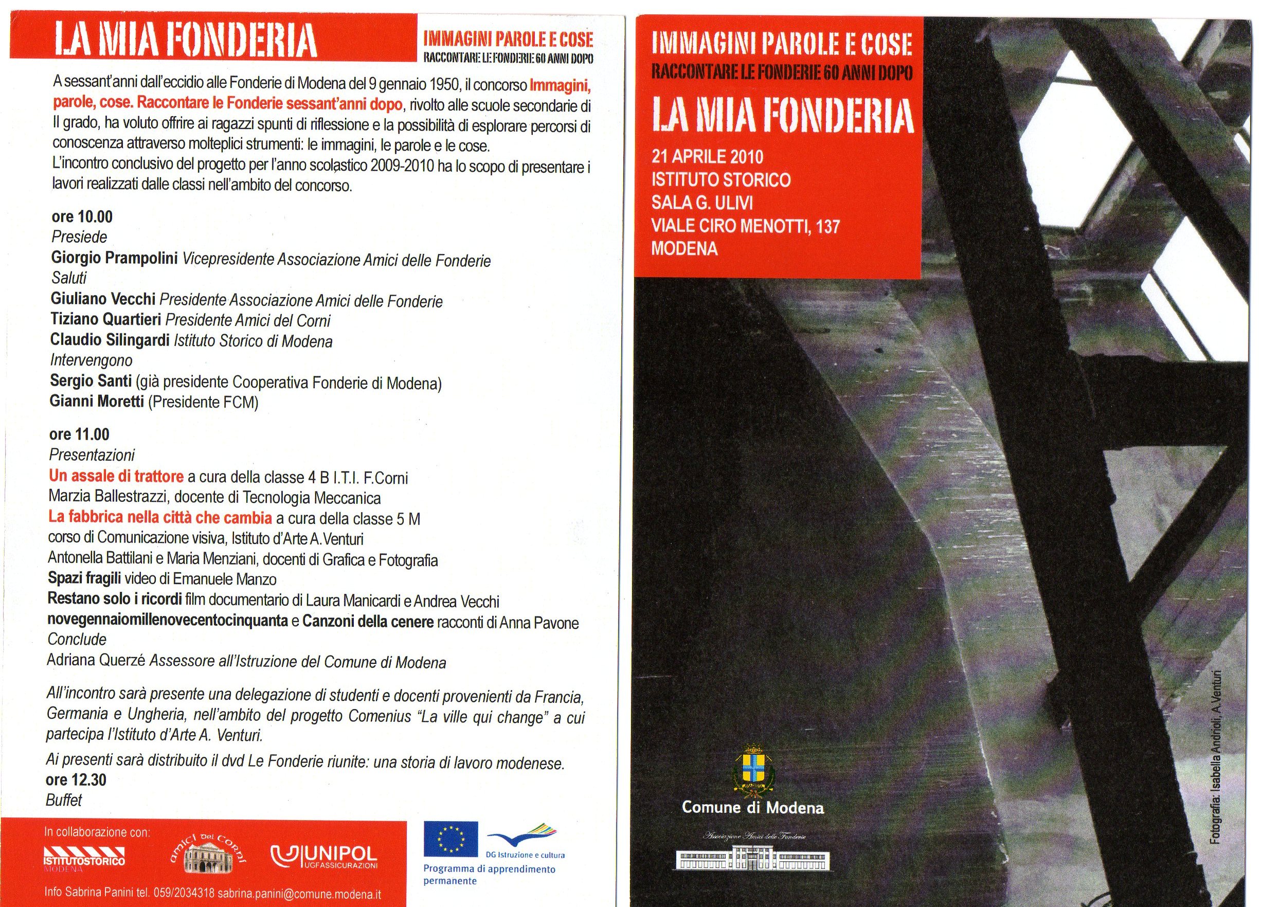 | A sessant'anni dall'eccidio alle Fonderie di Modena del 9 gennaio 1950, il concorso "Immagini, parole, cose. Raccontare le Fonderie sessant'anni dopo", rivolto alle scuole secondarie di II grado ha voluto offrire ai ragazzi spunti di riflessione e la possibilitą di esplorare percorsi di conoscenza attraverso molteplici strumenti: le immagini, le parole e le cose. L'incontro conclusivo del progetto per l'anno scolastico 2009/2010 ha lo scopo di presentare i lavori realizzati dalle classi nell'ambuto del concorso. Approfondimenti > guarda il programma |