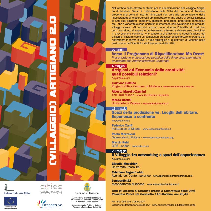 | Nell'ambito delle attivitą di studio per la riqualificazione del Villaggio Artigiano di Modena Ovest, il Laboratorio della Cittą del Comune di Modena propone una serie di incontri, finalizzati non solo alla presentazione delle linee progettuali elaborate dall'amministrazione, ma anche al coinvolgimento di tutti quei soggetti residenti, imprenditori, progettisti, proprietari immobiliari etc. che a vario titolo sono portatori di interesse nell'evoluzione dell'area del Villaggio stesso. Gli incontri proposti hanno dunque l'obiettivo di costruire, con il contributo di esperti e professionisti afferenti a diverse aree disciplinari, uno scenario condiviso, che consenta di affrontare la riqualificazione del Villaggio Artigiano come un complesso processo di rigenerazione urbana e di riaffermare in forme nuove il ruolo strategico di quest'area di Modena nella costruzione dell'identitą e dell'economia della cittą. Approfondimenti > scarica il programma della iniziative > vai alla pagina dedicata del Laboratorio della Cittą |